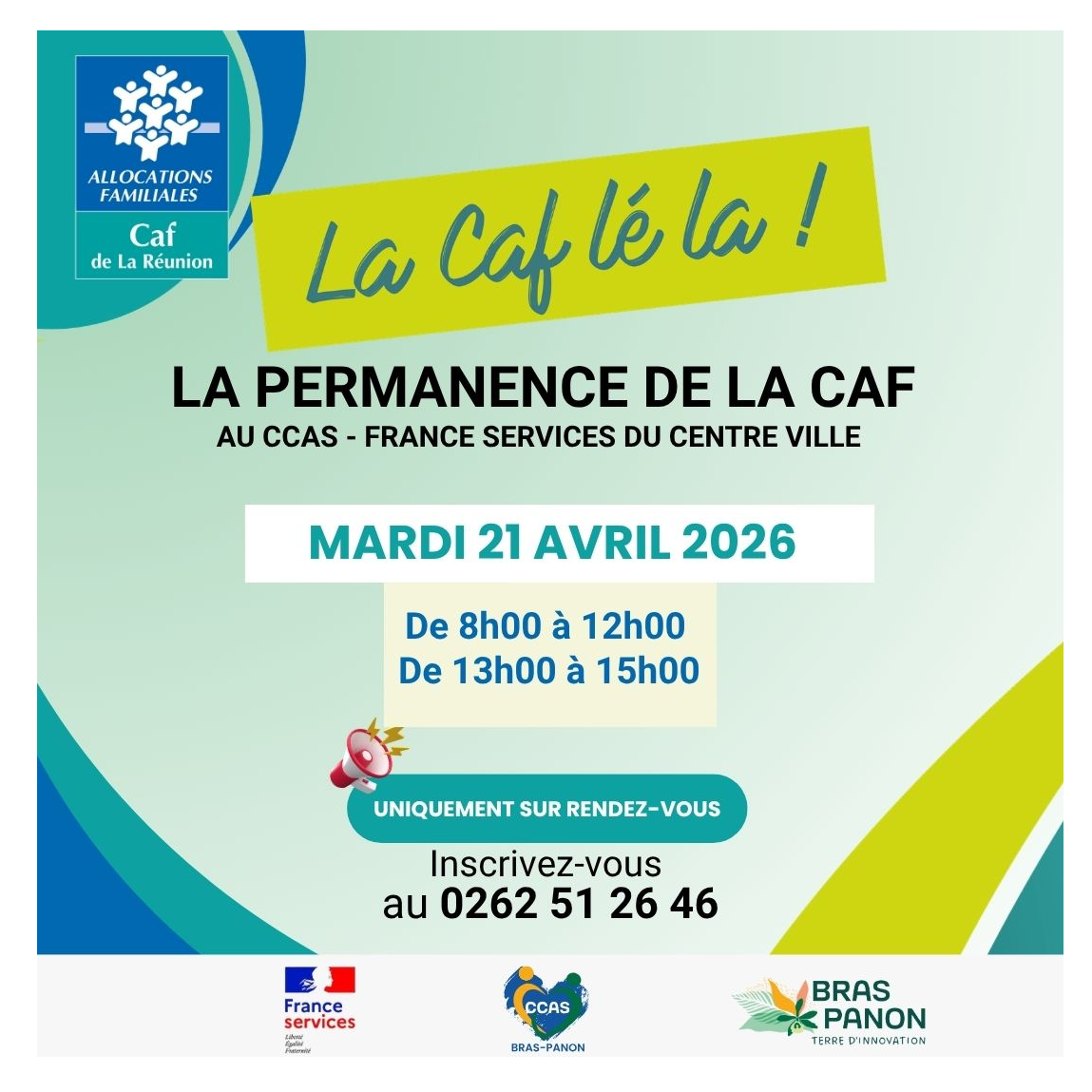 Permance de la CAF au CCAS Centre ville de Bras-Panon, le mardi 21 avril 2026 de 8h à 12h et de 13 à 15h.