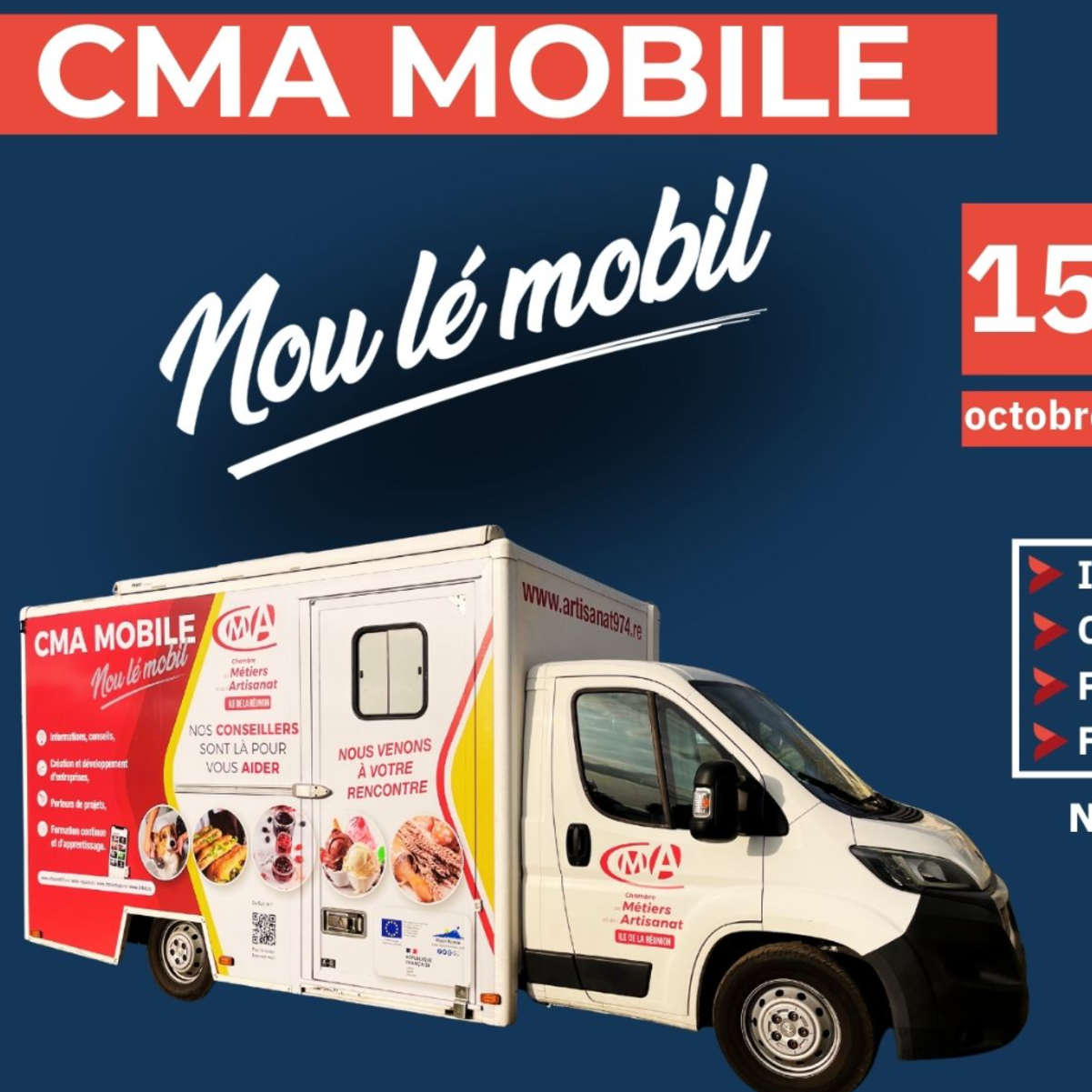 Le Mercredi 15 octobre 2025, retrouvez la Chambre des Métiers et de l'Artisanat (CMA) à Bras Panon sur le Parking de la piscine de 10h à 14h !