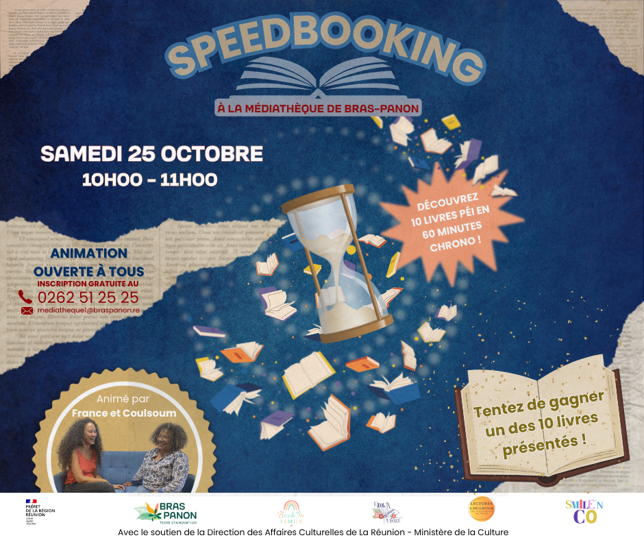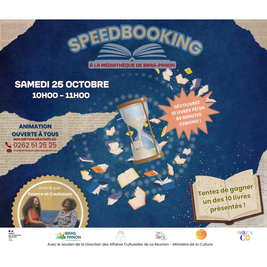 Rendez-vous à la médiathèque de Bras-Panon, le samedi 25 octobre 2025 de 10h à 11h, pour une expérience unique : le Speedbooking !
