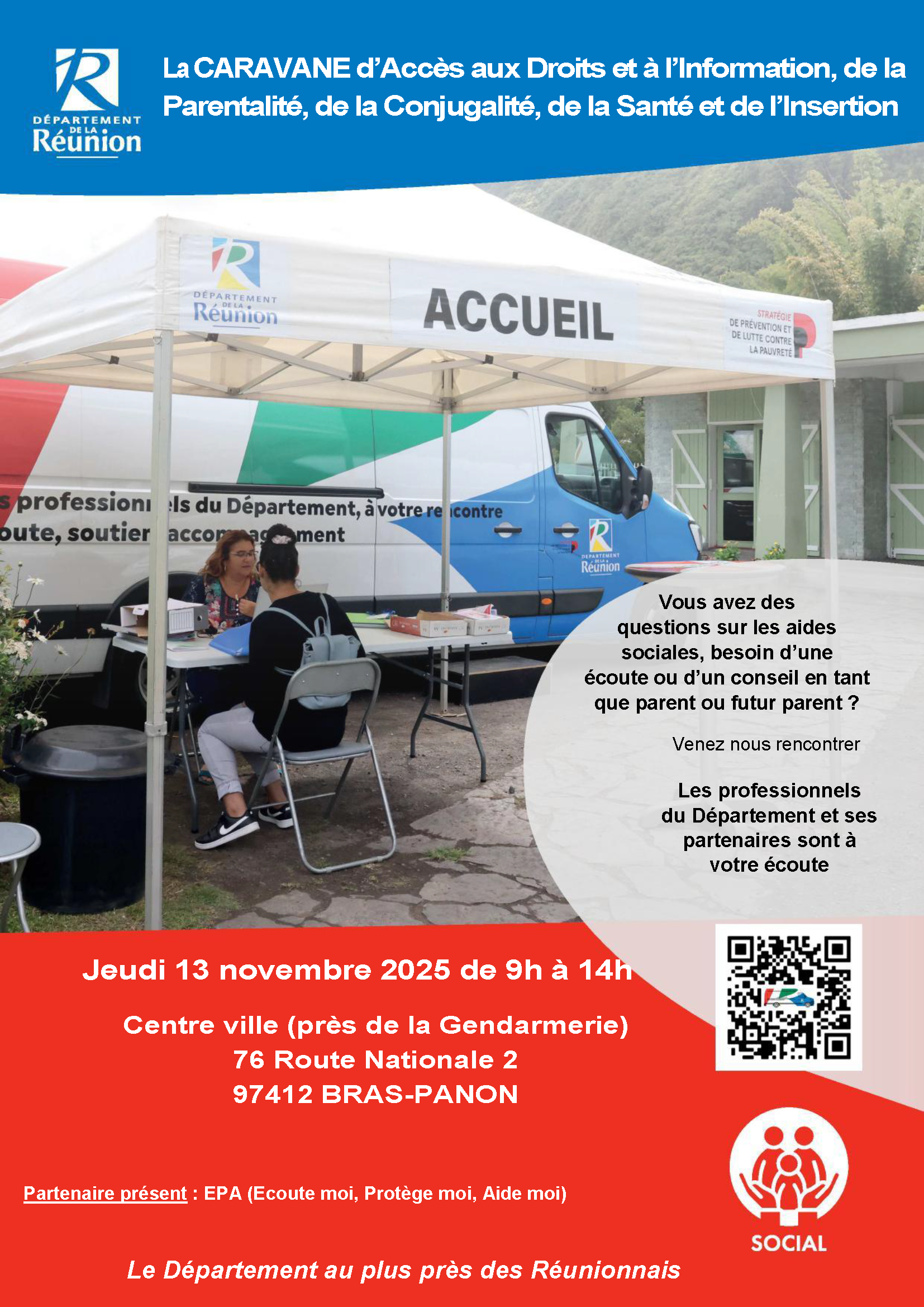 La caravane sociale du Département de La Réunion sera de nouveau sur Bras-Panon le jeudi 13 novembre de 9h à 14h au centre-ville près de la Gendarmerie.