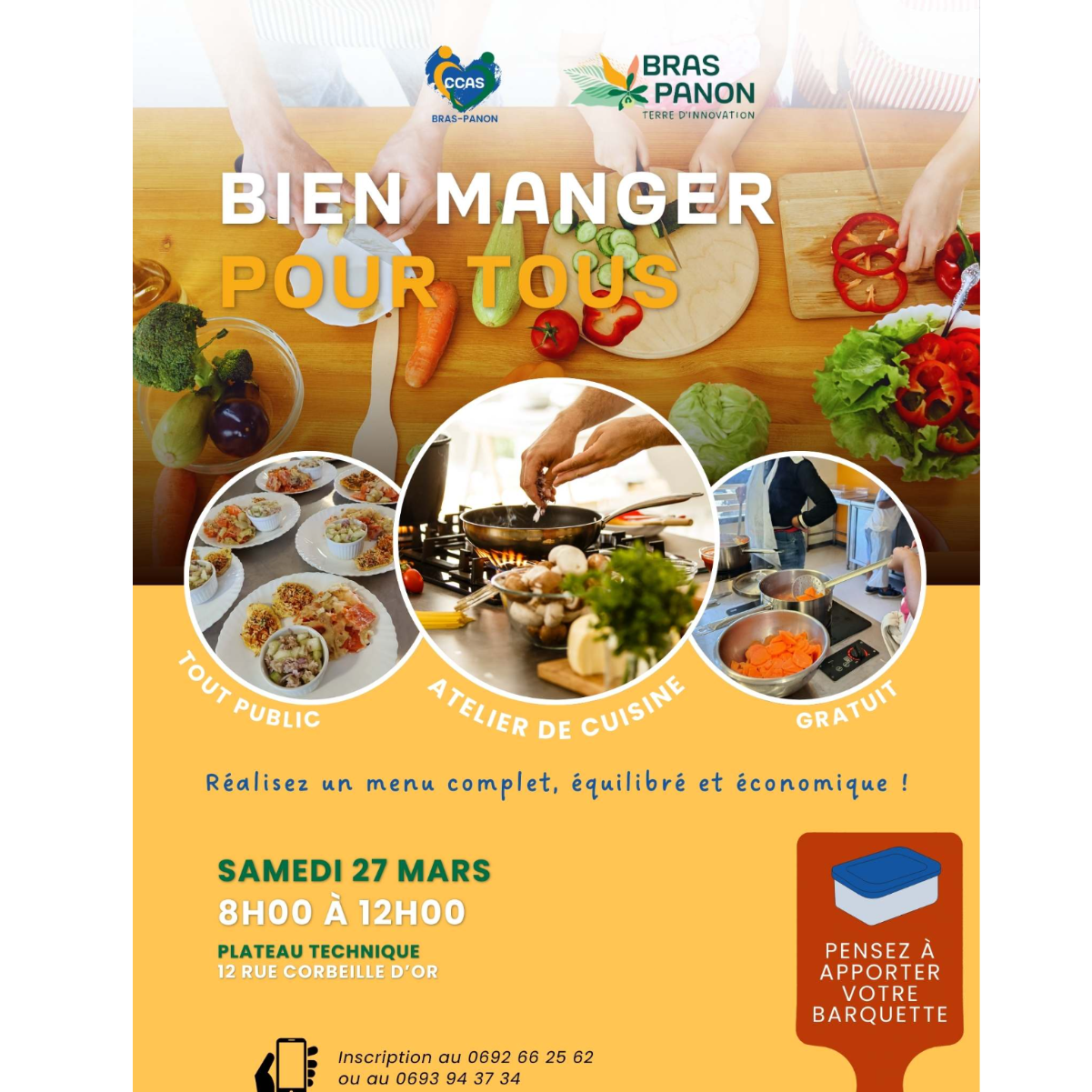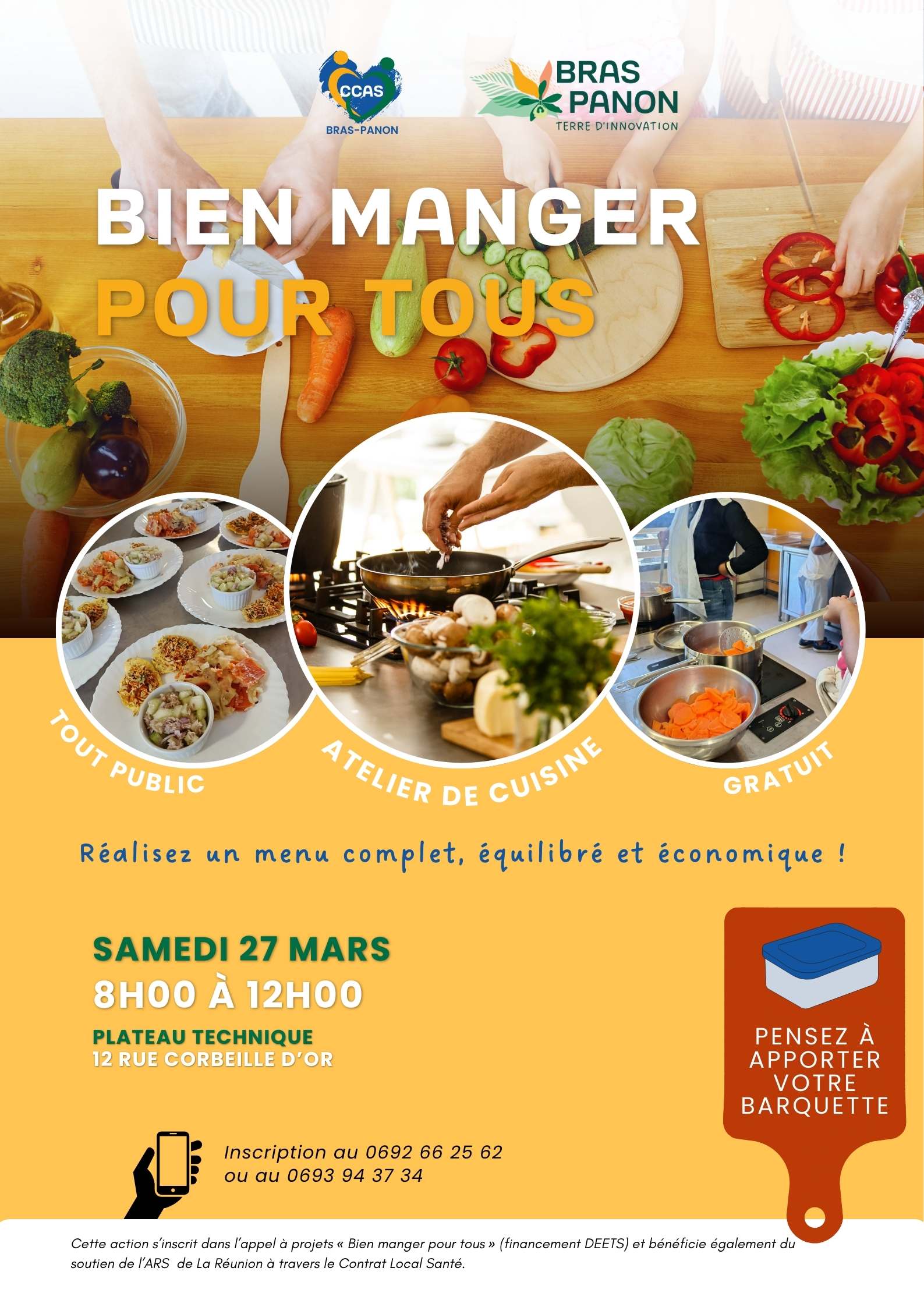Le CCAS de Bras-Panon vous invite à participer à des ateliers de cuisine collective au plateau technique de Bras-Panon (situé au 12 Rue des Corbeilles d'Or).